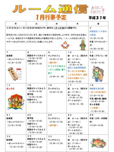【ルーム】ルーム通信1月号が完成しました。 12月 13, 2018 さいたま市若者自立支援ルーム 今年も残すところあとわずかですが、一足先に来年の1月号が完成しました。 初詣や歴史と民族の博物館見学等、外出プログラムが揃っています。 2019・1月号 Tweet
