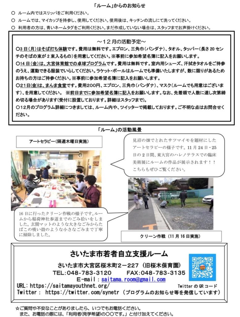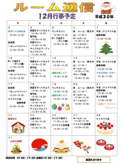 【ルーム】ルーム通信12月号が完成しました 11月 27, 2018 さいたま市若者自立支援ルーム 早いもので今年最後のルーム通信が完成しました。 今月のメインイベントはなんといっても28日の「クリスマス会」です。 演劇、音楽の発表に向けてルームの利用者さんが練習に励んでいます。 関係者には後日通知をお送りしますので、是非お越しください。 【DLはこちらから】 2018・12月号 Tweet