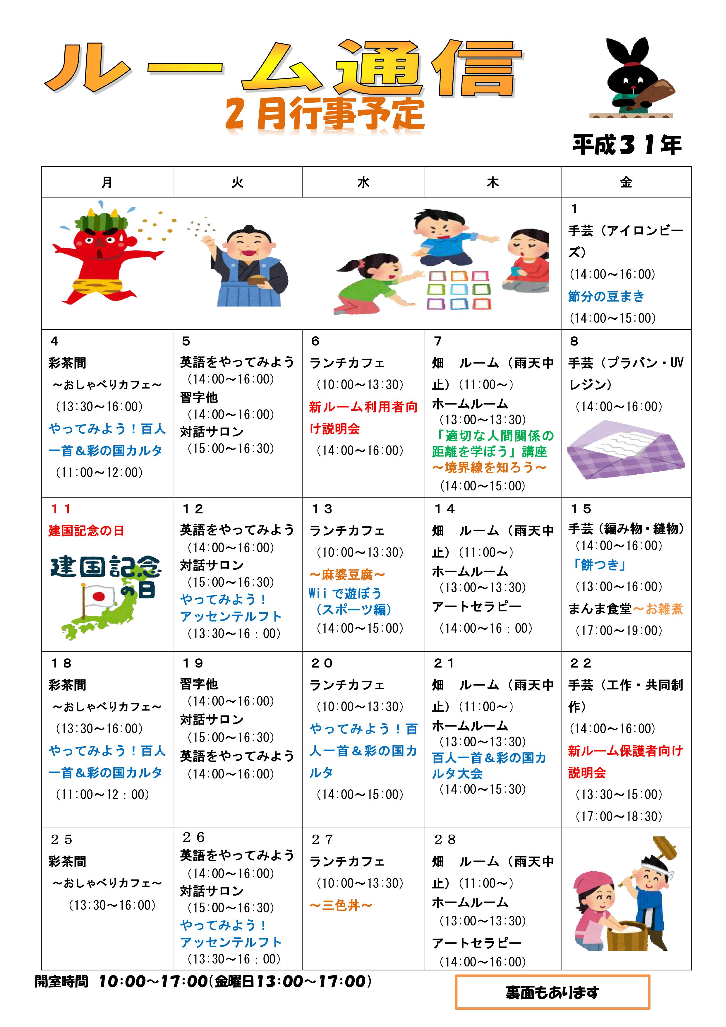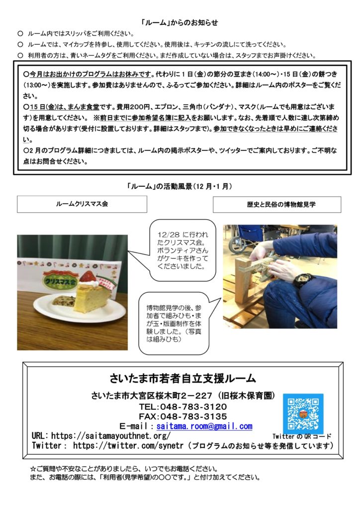 【ルーム】ルーム通信2月号が完成しました。 1月 24, 2019 さいたま市若者自立支援ルーム ルーム通信2019年2月号が完成しました。 今月は節分、餅つき大会、百人一首、彩の国カルタ等、季節の行事を盛りだくさん用意しています。 来年度の移転に伴う説明会も実施しますので、都合をつけられる方は是非ご参加ください。 Tweet
