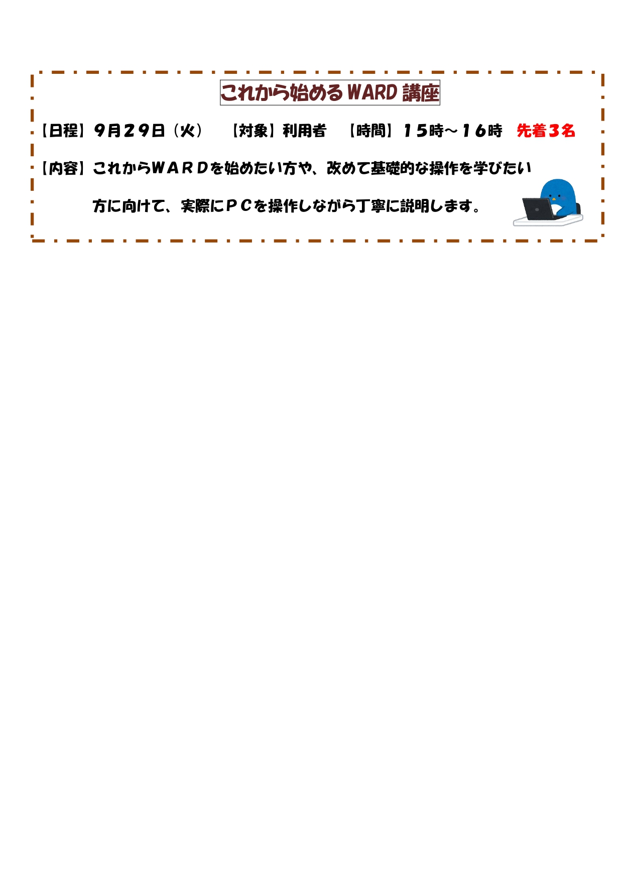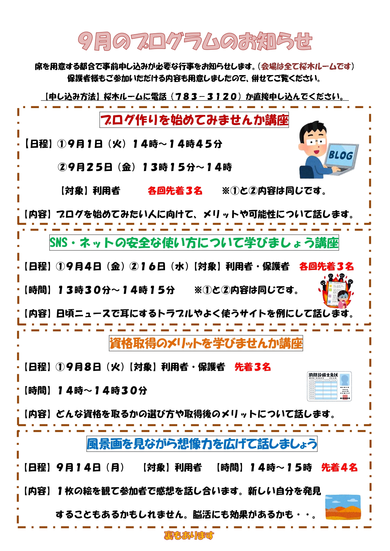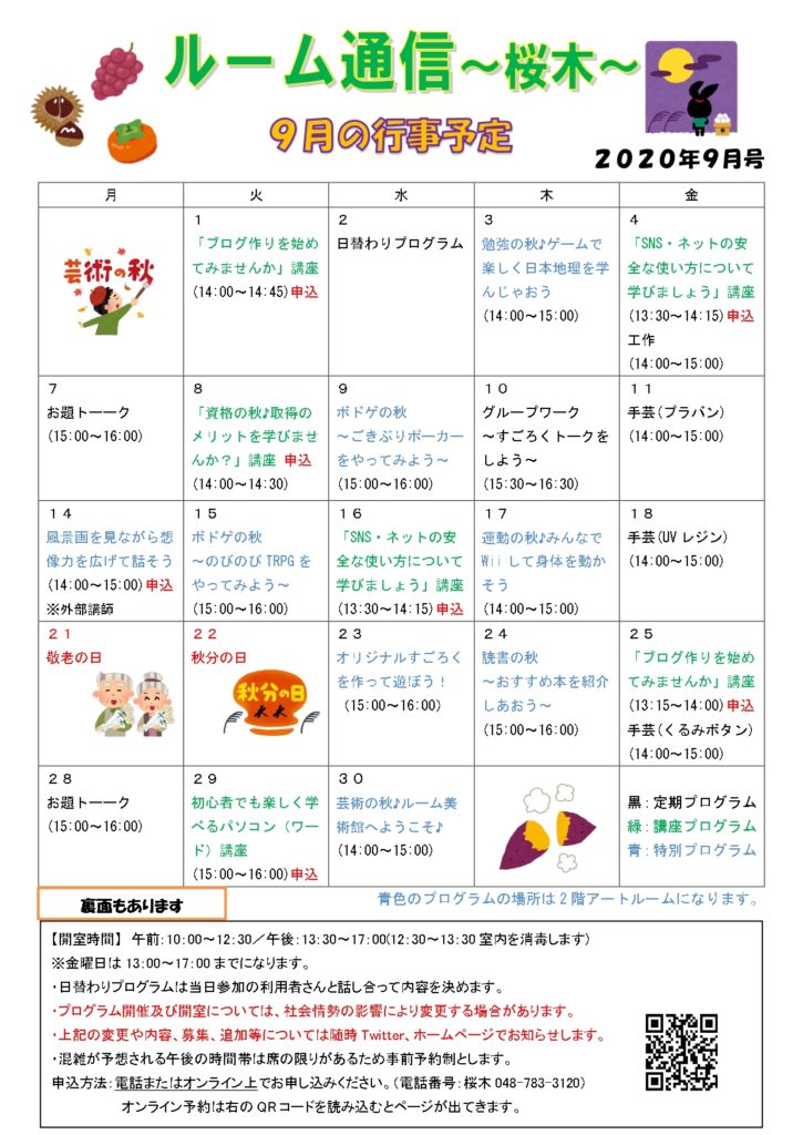 来月は三密対策をしながら、秋を意識したようなプログラムやお役に立つミニ講座等、複数用意しています。