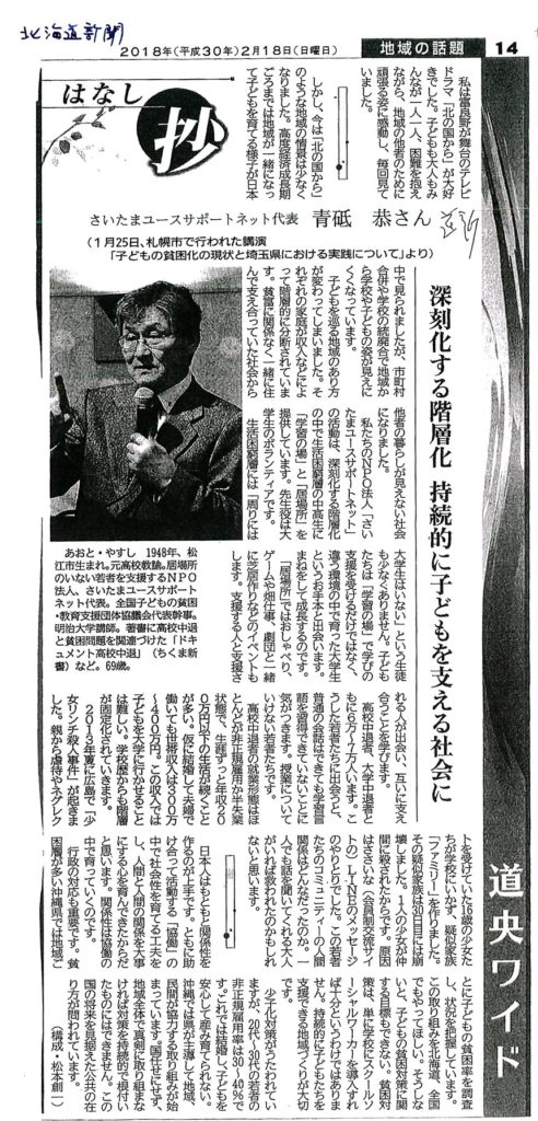 【北海道新聞】深刻化する階層化 持続的に子どもを支える社会に(2018.2.18)