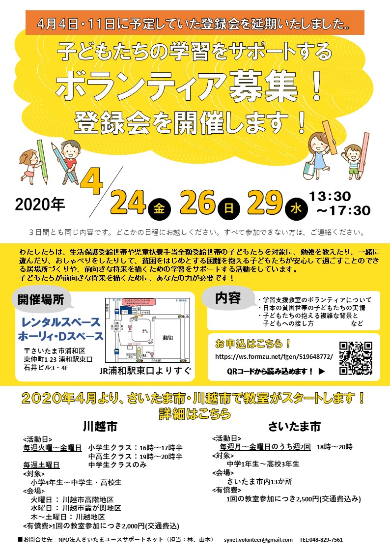 4月4日、11日に予定しておりました「学習支援ボランティア登録会・研修会」ですが、