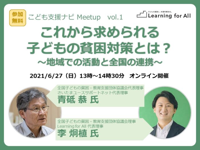 • 【6月27日】こども支援ナビ Meetup vol.1 これから求められる子どもの貧困対策とは?~地域での活動と全国の連携~