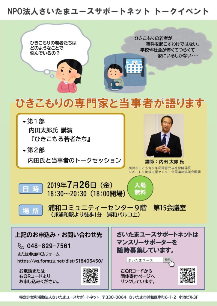 さいたまユース主催トークイベントのお知らせ 7月 3, 2019 お知らせ 不登校、ひきこもり、若者 さいたまユース主催のトークイベントを開催いたします。 今回は『ひきこもり』をテーマに、 専門家と当事者の若者を招いてお話をして頂きます。 是非お越しください。 Tweet