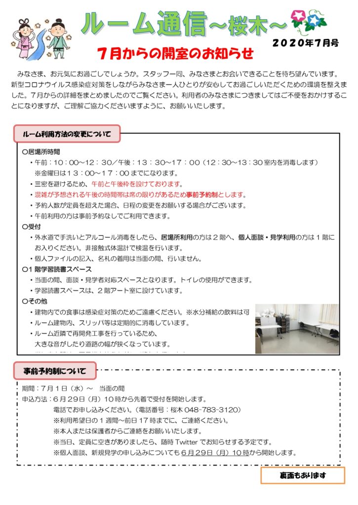 さいたま市若者自立支援ルーム桜木7月開室につきまして