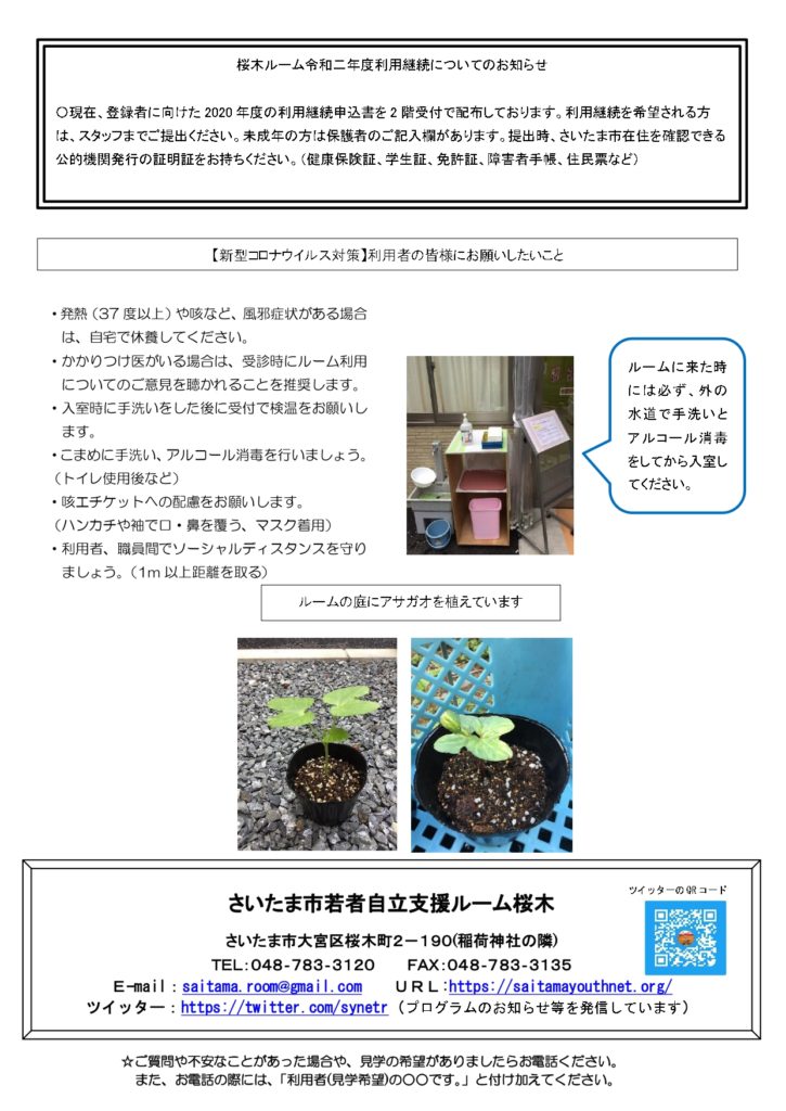 みなさまには、日ごろから、さいたま市若者自立支援ルーム(以下ルーム)をご利用いただき、ありがとうございます。