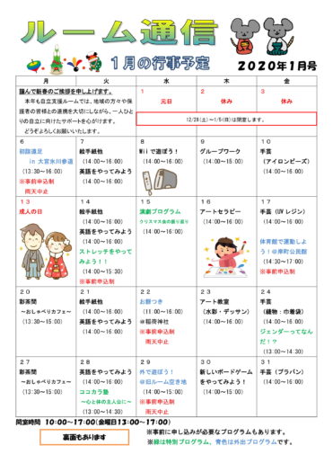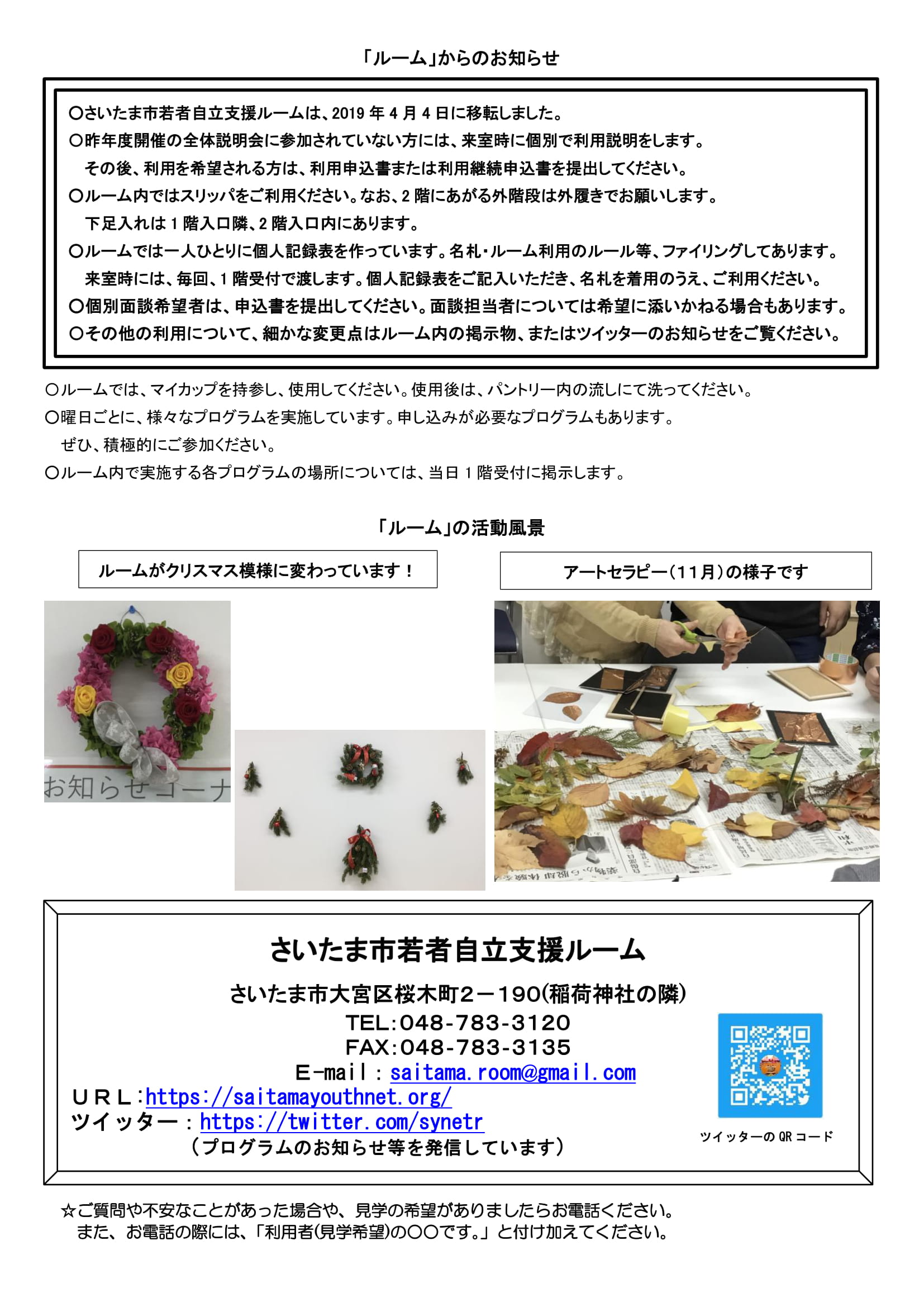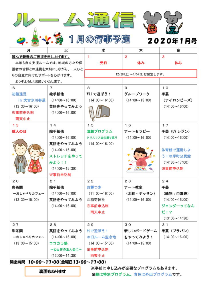 ルーム通信1月号が完成しました【ルーム】 12月 19, 2019 さいたま市若者自立支援ルーム ルーム通信1月号が完成しました。 2020年の第一号になります。 年末年始は12月28日(土)~1月5日(日)までが閉室になります。 新年は1月6日(月)10時からの開室になります。 来年もなにとぞよろしくお願いいたします。 Tweet