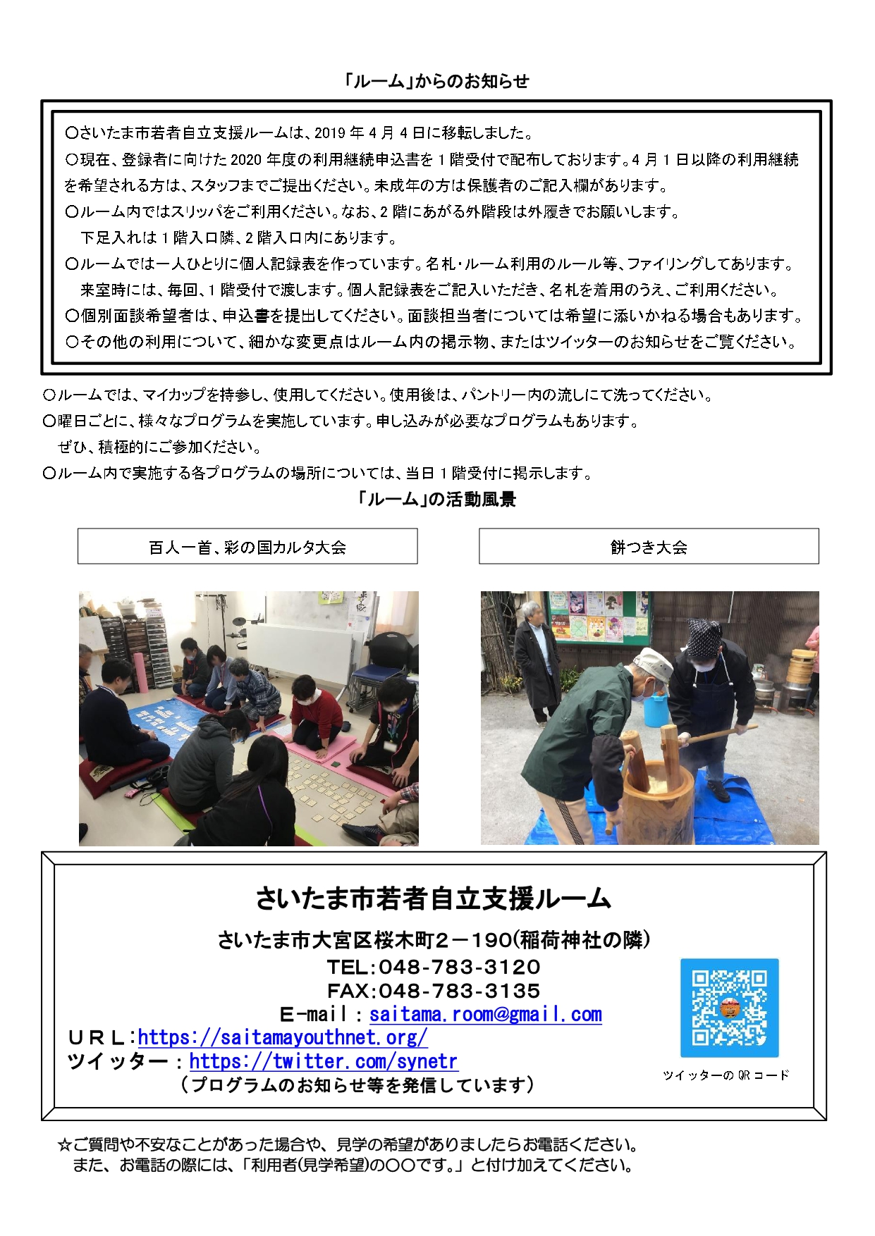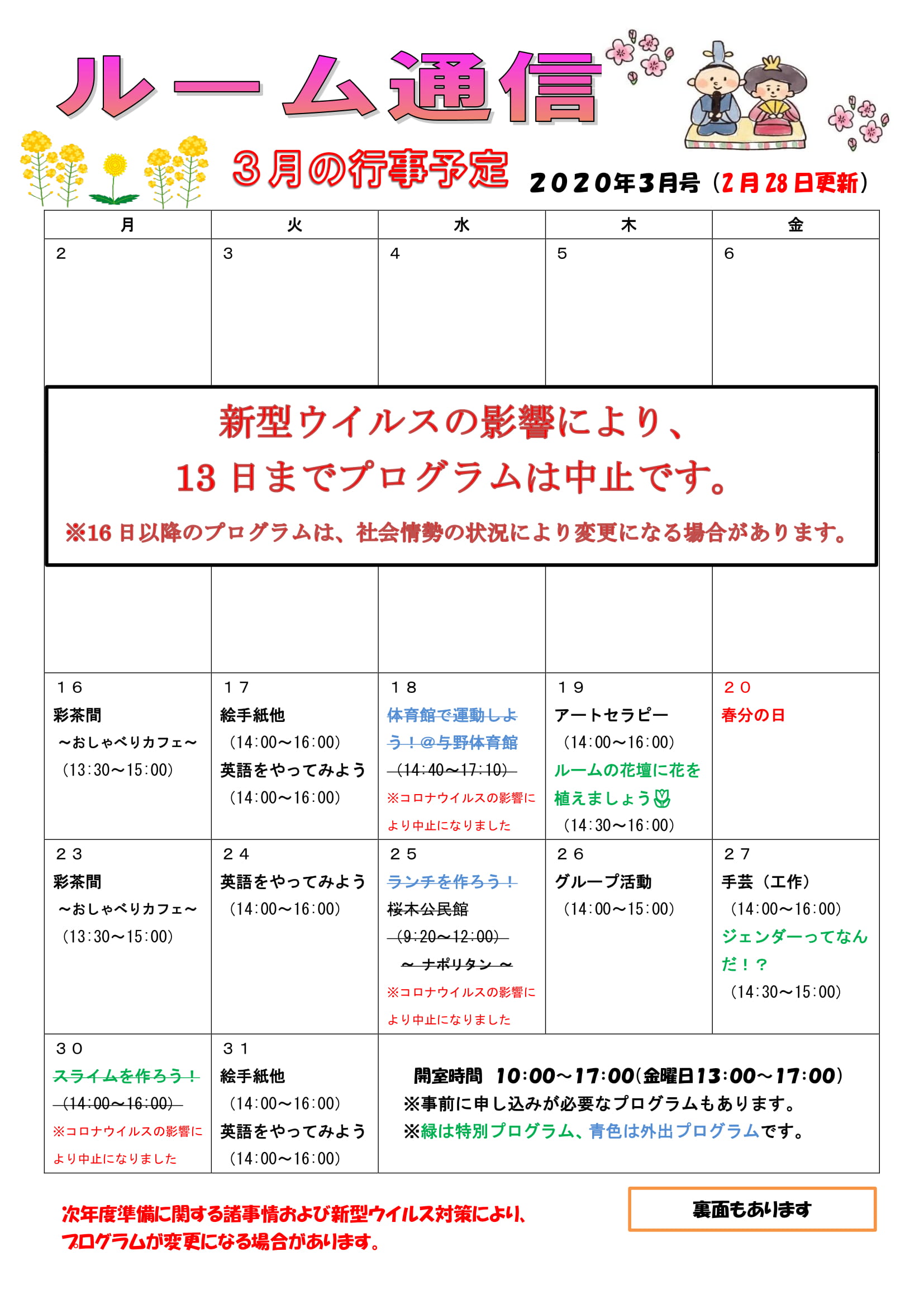 ルーム通信3月号が完成しました【ルーム】 2月 26, 2020 さいたま市若者自立支援ルーム 2020年2月28日11時30分更新 お待たせいたしました。 自立支援ルーム令和元年度最後の通信が完成しました。 2月28日時点で、一部内容を差し換えました。新型ウイルス対策で、13日(金)までの全てのプログラムを中止とさせていただきます。 16日(月)に関しましては、情勢を見ながら判断いたします。 中止や変更をする際は、ホームページやTwitterでお知らせします。 Tweet