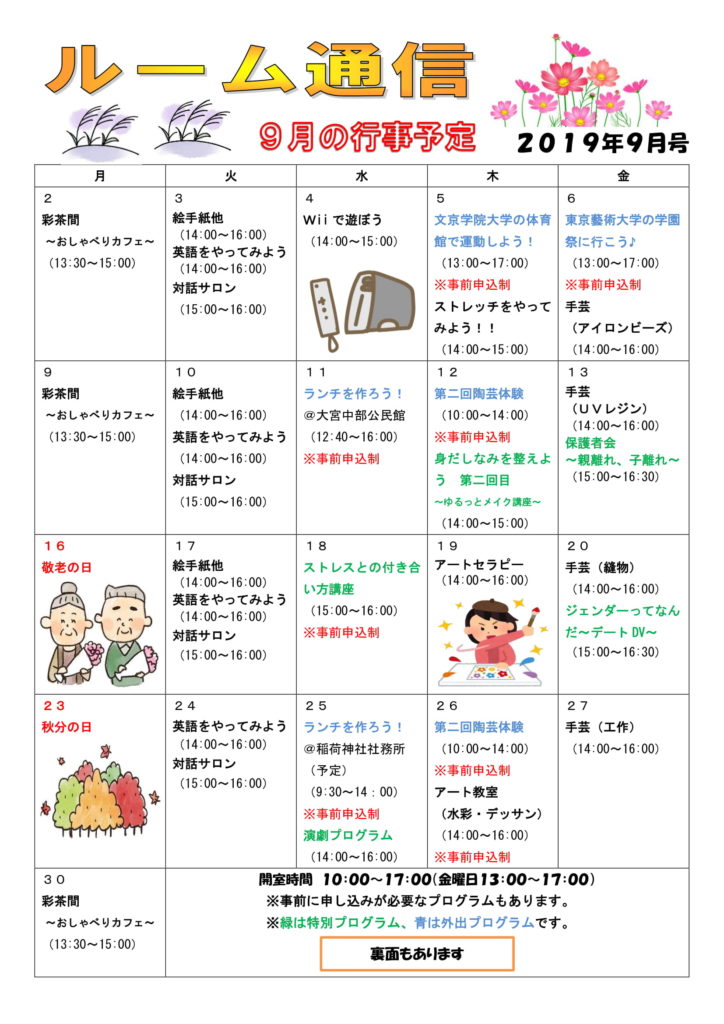 9月は外出プログラムが複数あり、ルーム内のプログラムも多数用意しています。