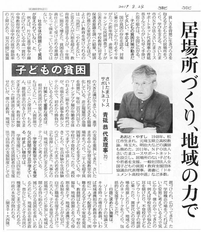 東京新聞8月24日埼玉版にてインタビュー記事が掲載されました。