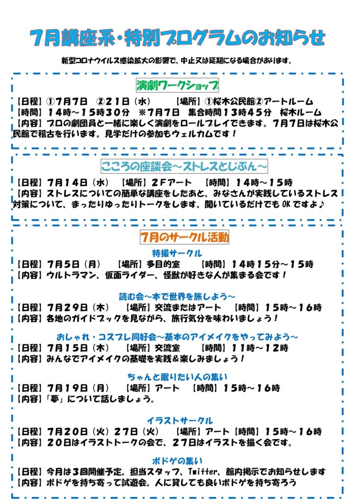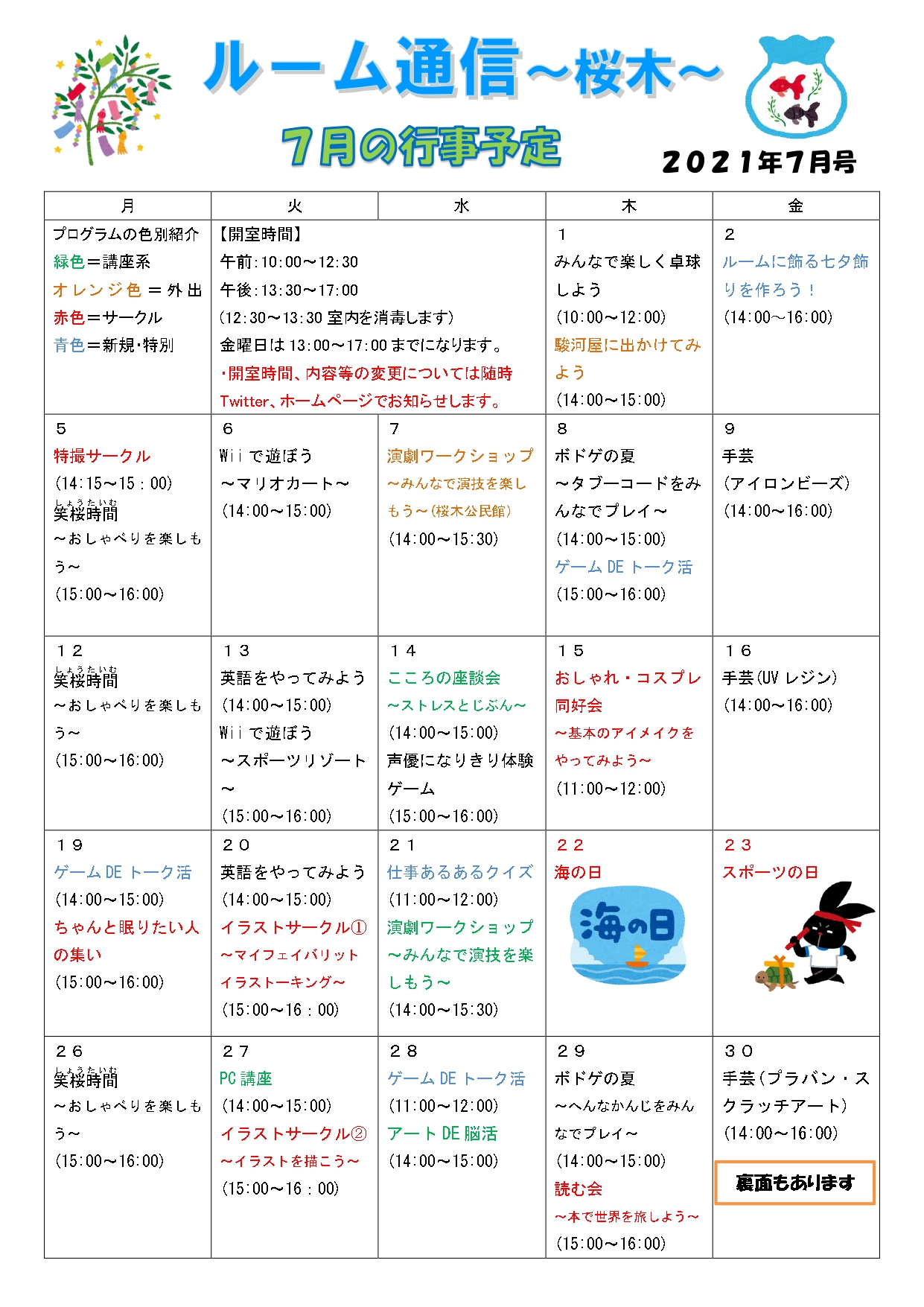 桜木ルーム通信7月号を作成しました【桜木ルーム】 6月 28, 2021 さいたま市若者自立支援ルーム 7月は暑い中お越しになられたみなさんが有意義に、そして楽しく取り組めるプログラムを多数用意しました。 午前中の時間帯に実施するものや、新規のプログラムを複数用意してお待ちしております。 Tweet