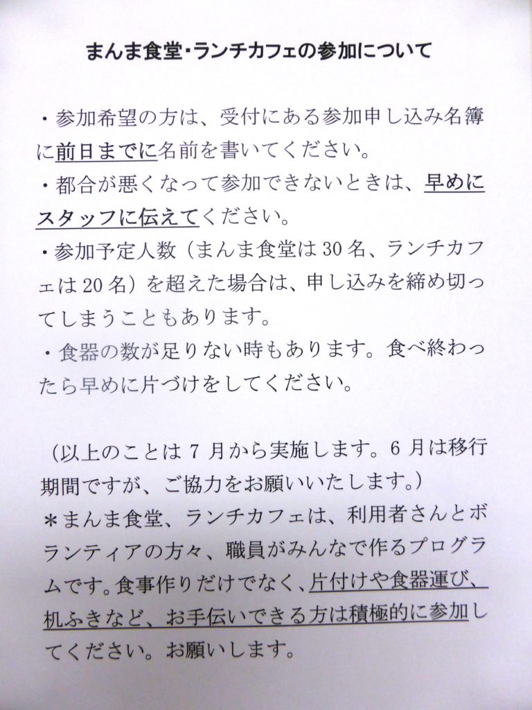 6月以降のまんま食堂・ランチカフェの参加について【若者自立支援ルームより】 5月 28, 2018 お知らせ 若者自立支援ルームからのお知らせです。 6月以降のランチカフェとまんま食堂の参加について変更点とお願いを載せております。 今後参加をご希望・ご検討される方はお目通しください。 Tweet